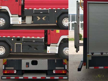| 水罐容积:16.55立方米,水罐尺寸: 5400X2420X1320mm.整体式侧防护结构,后防护装置材料:Q235A,截面尺寸120×120mm,与车辆连接方式:螺栓连接,离地高度435mm.ABS系统型号为4460046300,生产企业为威伯科汽车控制系统(中国)有限公司. 后伸145mm.主要专用装置有消防泵、消防炮. |
