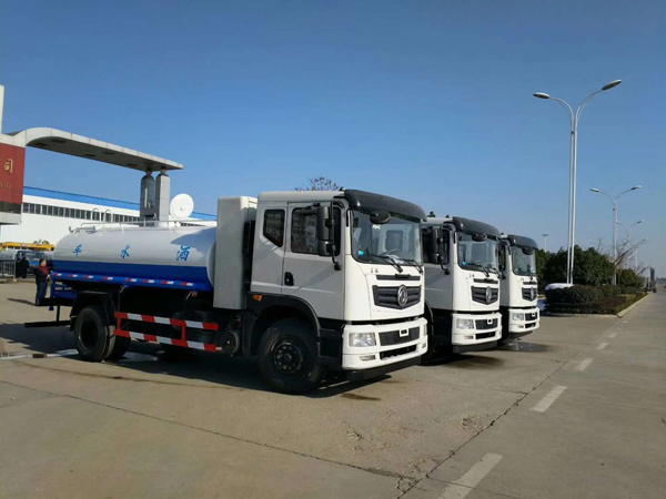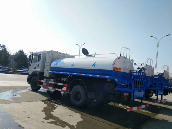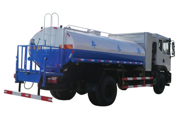 标准配置:罐体材质为厚4mm武钢优质板材(罐体内部加装防震荡板),洒水泵,洒水高炮,工作平台,取力器,前冲,后洒,自流阀,滤网,分配阀,喷头,带自吸自排功能。