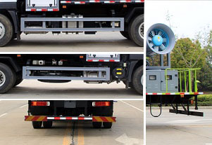 | 专用装置为抑尘雾炮,用于城市抑尘.整车长/轴距/后悬对应关系为(mm):8970/5500/2200;8650/4500/2880;防护材料:Q235B碳钢,连接方式:左右侧面采用焊接连接,后下部防护采用焊接连接,后部防护断面尺寸(mm):150×50,后部防护离地高度(mm):500.ABS系统型号/生产企业对应关系:ABS-E/威伯科汽车控制系统(中国)有限公司;ABS/ASR-24V-4S/4M/东科克诺尔商用车制动系统(十堰)有限公司.根据市场需求,扩展驾驶室。 |