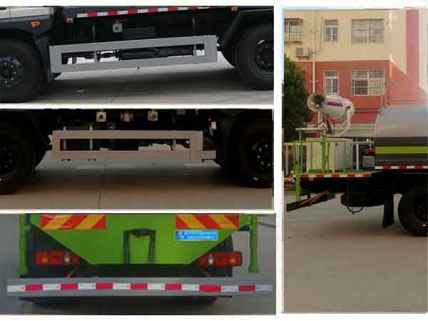 | 专用装置为抑尘雾炮,用于城市抑尘,整车长度/轴距的对应关系为(mm):7700/3950,7950/4200,8250/4500,8450/4700,8850/5100,9350/5600;侧防护及后下部防护装置均采用Q235A材质,均采用焊接连接,后下部防护尺寸:120×50(mm),离地面高度500mm.ABS型号及生产厂家为:3631010-C2000/东科克诺尔商用车制动系统(十堰)有限公司,J ABS/焦作博瑞克控制技术有限公司.当整备质量为(kg):6680时,轴距为(mm):3950,4200,4500,当整备质量为(kg):7280时,轴距为(mm)4700,5100,5600. |