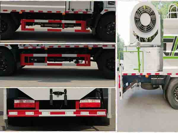 | 专用装置为抑尘雾炮,用于城市抑尘.整车长/轴距对应关系为(mm):7000/3600;7200/3800,7350/3950,7450/4050,7500/4100,7800/4400.防护材料:Q235A碳钢,连接方式:左右侧面及后下部防护均采用焊接连接,后部防护断面尺寸(mm):120×50,后部防护离地高度(mm):400.ABS型号/厂家:ABS型号:ABS/ASR-24V-4S/4M,厂家:襄阳东风隆诚机械有限责任公司.当整备质量为6688kg时,选用轴距为(mm):3600/3800/3950;当整备质量为7288kg时,选用轴距为(mm):4050/4100/4400.随底盘选装驾驶室. |